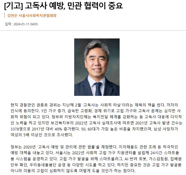 기사 링크: [기고] 고독사 예방, 민관 협력이 중요-국민일보 (kmib.co.kr)