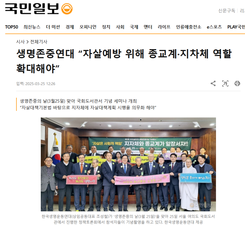 | 제목 | [25.03.25 국민일보] 생명존중연대 “자살예방 위해 종교계·지차체 역할 확대해야” | ||||