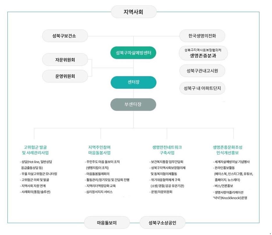 성북구자살예방센터는 인적·물적·심리정서적인 개입을 통한 사회복지적 접근을 동등하게 상호작용함과 동시에